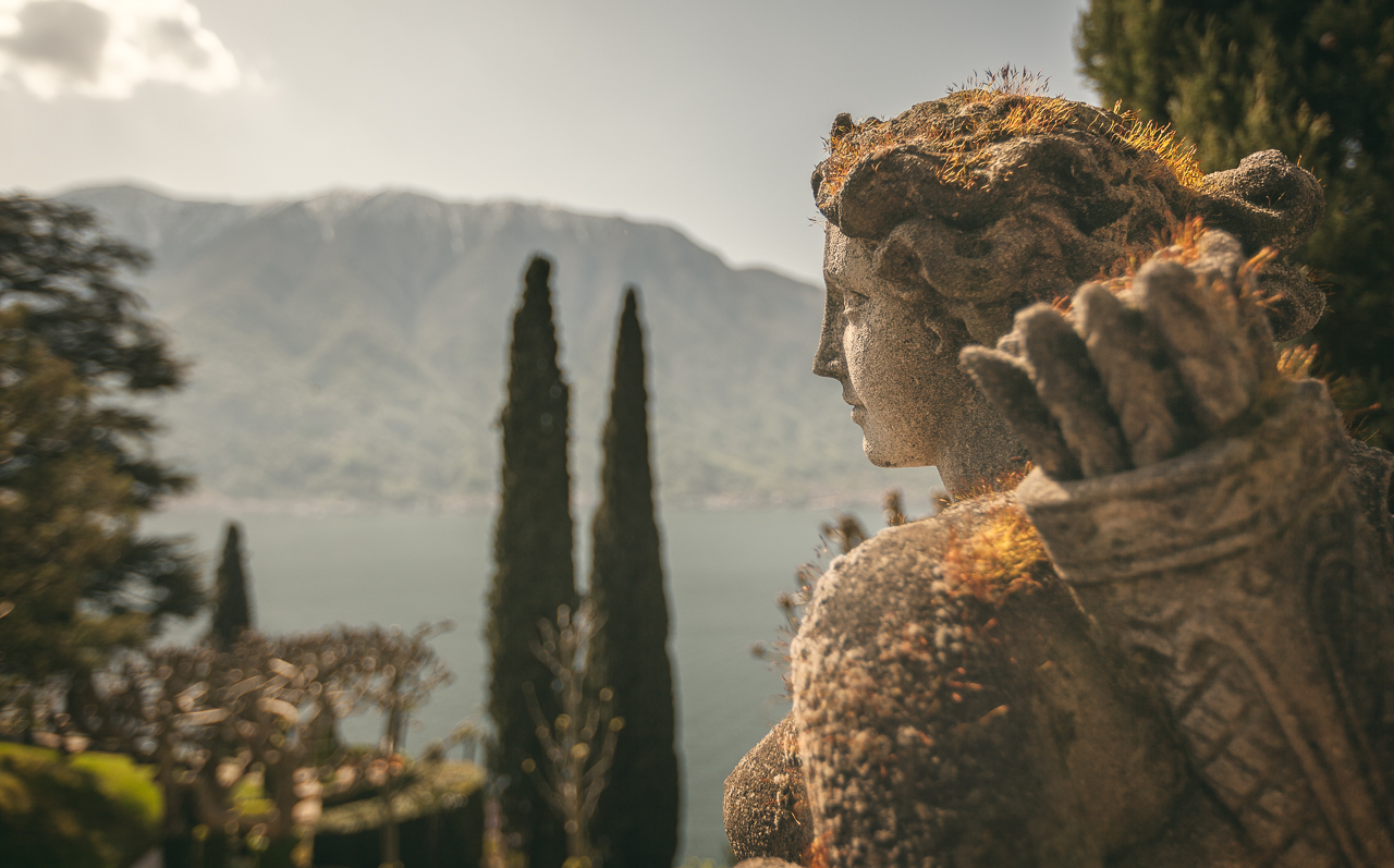 - An statue of a female archer looks longingly out over the coastline of Villa del Balbianello on Lago Como, Italy.