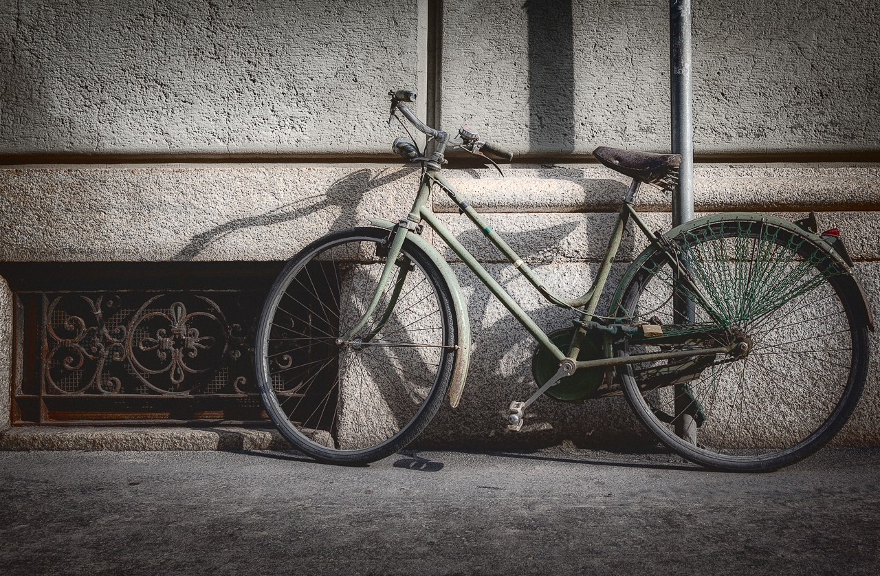 - An old bicycle is locked up to a post on the streets of Milan, Italy.